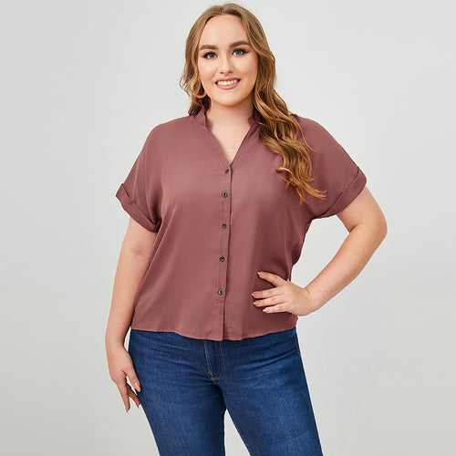 Plus Size Button Down Notched Neck Rolled Short Sleeve Shirt