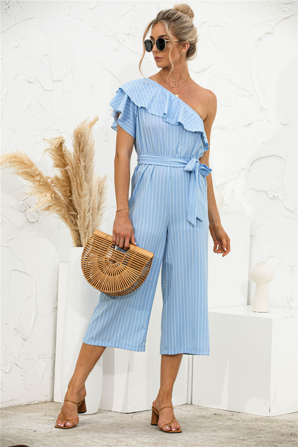 - Features: Sleeveless, ruffle trim, belt, high waist, wide leg, capri