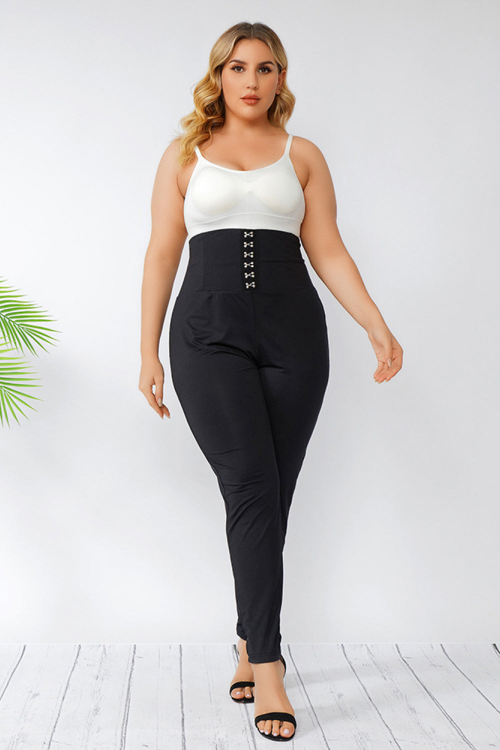 - Features: High waistband, hook and eye closure, tapered leg, ankle-length