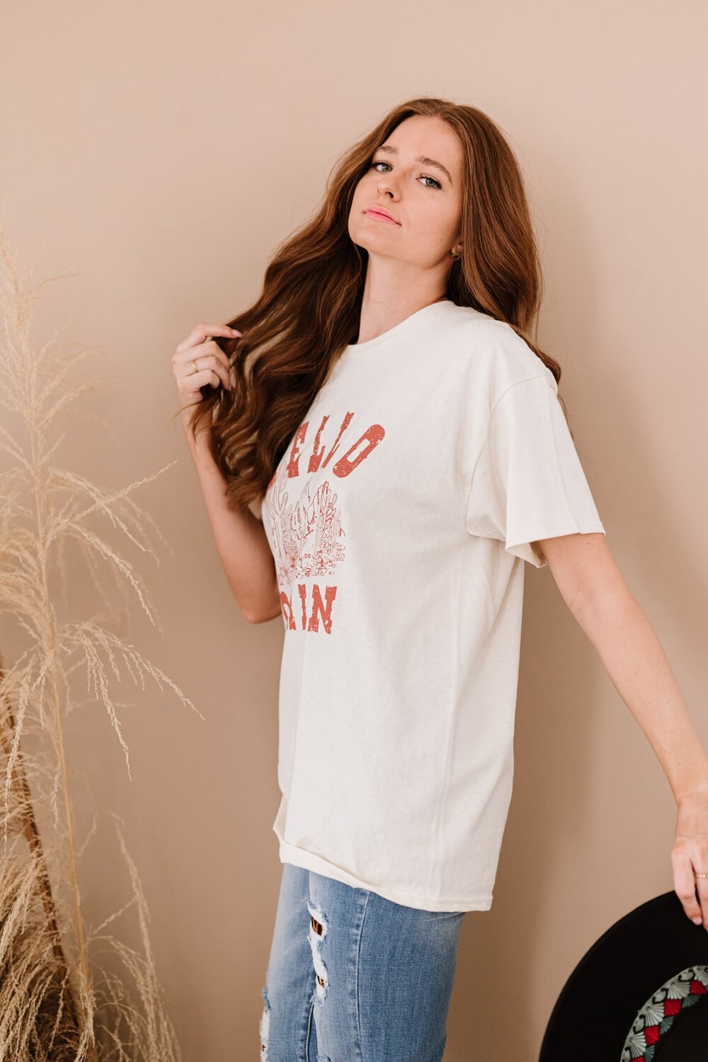 This tee is for the cowgirls and cowgirls at heart. "HELLO DARLIN" is printed in the cutest Western-inspired font on a natural, unbleached cotton. The moderate stretch, oversized fit, and soft fabric will keep you comfortable, while the lighter weight and slight sheerness will keep you cool. Pair with shorts and cowboy boots and wear to the rodeo!